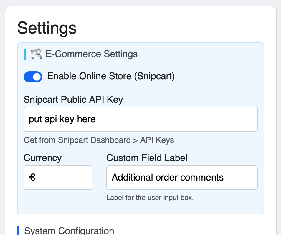 When it’s not enabled, the system works as an online product catalogue. Enable ecommerce, add your SnipCart API key, tell it the currency you are using, and BOOM! It’s now a fully-loaded online store, with full checkout with payment processing by whatever gateway you choose. Plus, all the other ecommerce features that Snipcart offers.